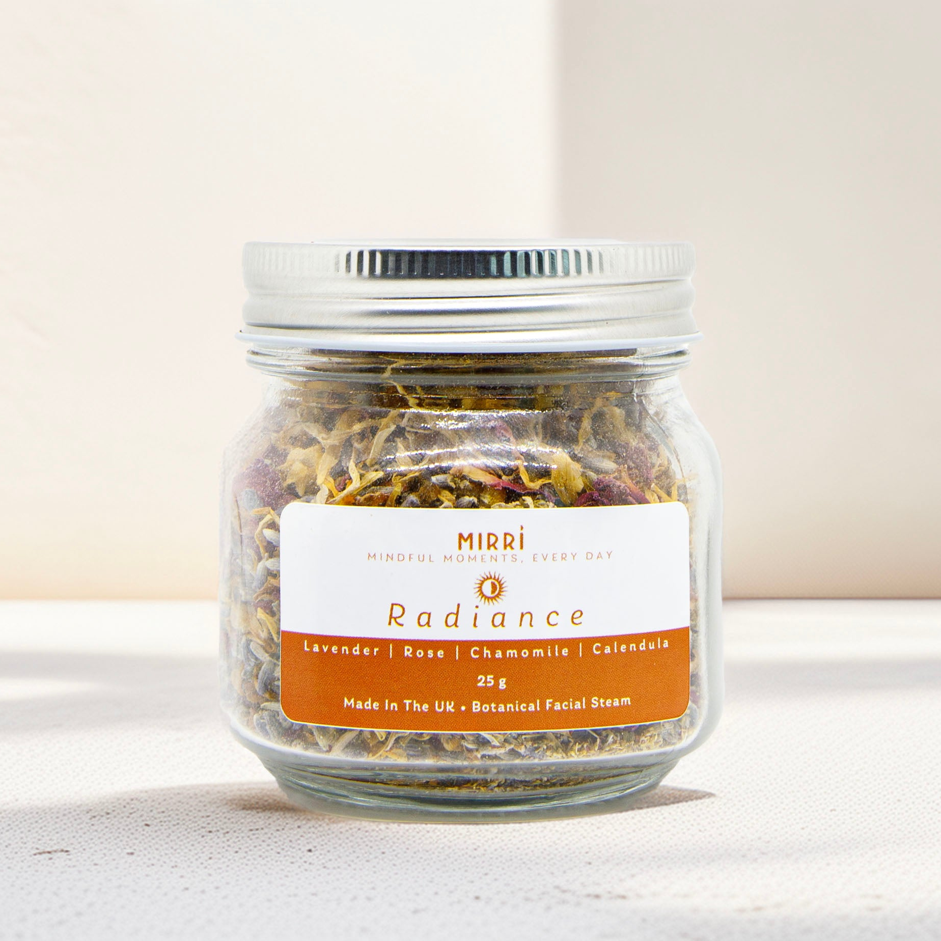 Bring a small pot of water to a gentle steam. Add a teaspoon of Radiance Facial Steam Blend and let the aromatic botanicals infuse the air. Close your eyes, drape a towel over your head, and lean over the steam at a comfortable distance. Inhale deeply, letting the calming floral scents envelop you. With each breath, feel your skin awaken, your mind soften, and your spirit refresh. Allow this moment to be a pause -a nurturing, mindful ritual that restores both skin and self.